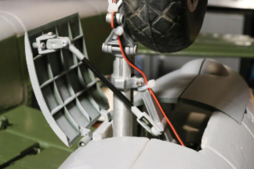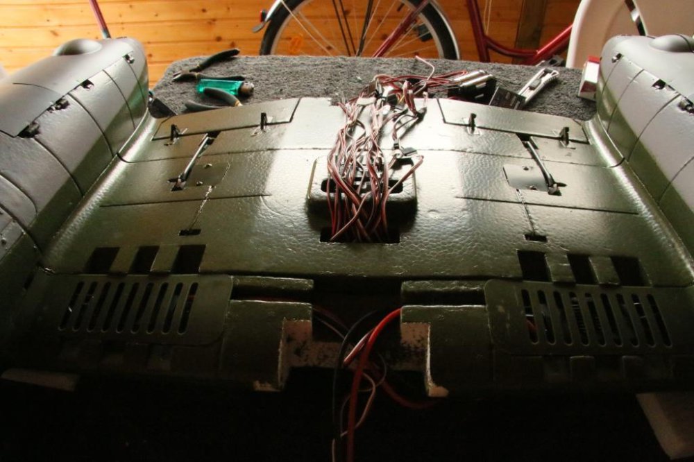 So kann die Abdeckung jederzeit wieder geöffnet werden. Der Bombenschacht wurde ebenfals in Betrieb genommen, muss aber noch fein eingestellt werden, damit das Servoknistern aufhört. Es wurde auch ein erster Fahrversuch unternommen um den Geradeauslauf einzustellen. Ich möchte an dieser Stelle erwähnen, dass ich das nicht über die Servomitte am Sender mache sondern alles mechanisch einstelle. Für das Heck habe ich zunächst 70% Expo eingestellt, denn das Bugrad reagiert sehr heftig auf die Lenkbewegungen. Der nächste Schritt wird jetzt die Verkabelung am Empfänger und Test aller Funktionen sein.