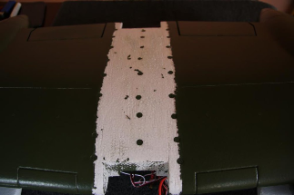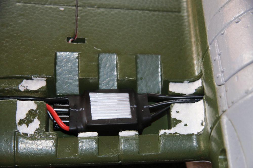 Nachdem die Teile geklebt waren und in der Ecke zum trocknen standen habe ich das mittlere Teil der Tragflächen begutachtet. Hierbei habe ich ein paar Dinge gefunden die vielleicht nicht so trivial sind, mich aber persönlich gestört haben. Die Fahrtenregler die in der Fläche verbaut sind, waren komplett mit Schrumpfschlauch eingepackt und mit Lüftungsgitter aus Plastik abgedeckt. Um den Reglern eine besser Kühlung zu verschaffen entfernte ich das Lüftungsgitter, danach wurde der Schrumpfschlauch auf den Oberseiten der Kühlfläche entfernt. Damit das Aluminium nicht so durchschimmert wurden die Kühlkörper schwarz gestrichen. Anschließend wurden die Lüftungsgitter wieder an ihrer Position mit dem beigefügten Kleber befestigt.