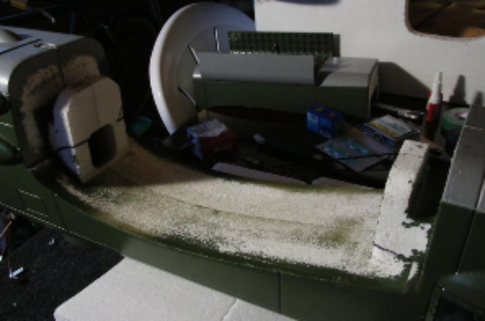 Bevor es an das Verkleben der beiden Rumpfteile ging wurde der Innenraum des Hauptrumpfes hinter den Geschützen noch mit schwarzer Farbe angepinselt. Danach wurden am Hauptrumpf die Klebstelle geschliffen, der Staub wurde entfernt und mit Alkohol abgerieben. Im Anschluß wurden die beiden Teile an den Klebestellen mit 2K Epoxidharz (30min.) eingestrichen und miteinander verklebt. Klebereste am besten gleich mit Alkohol entfernen. Prüfen ob die Teile auch alle schön gerade sind und 24 Stunden trocknen lassen.
