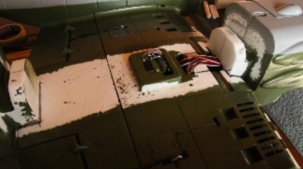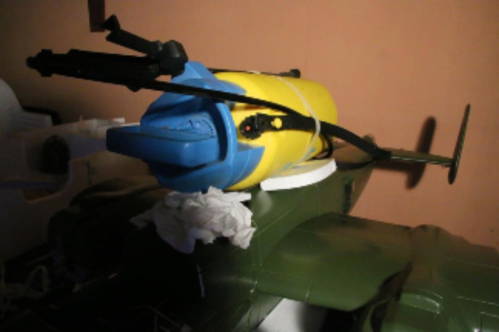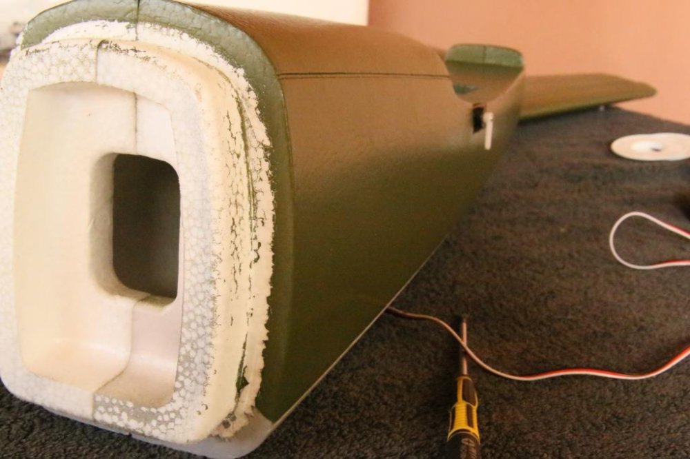 Zu Hause angekommen wurden alle Funktionen erneut überprüft. Alle Servos arbeiten einwandfrei. Maschine eingehängt, das tolle selbst gebaute Teil zum ausbalancieren, Fahrwerk einfahren und wieder ausfahren. Und da war es wieder, das Problem mit dem Fahrwerk. Diesmal war es die andere Seite, nur mit dem Unterschied, dass das Fahrwerk gar nichts mehr machte. Die Klappen gingen alle noch auf aber ein Fahrwerkbein fuhr nicht ein. Also also wieder Fahrwerk ausfahren und dann kam das nächste Problem, die Fahrwerksklappen gingen nicht mehr zu. Nun ging es an die Fehlersuche. Der erste Weg führt mich zum Fahrwerkscontroller und siehe da, zwei kalte Lötstellen sorgten dafür dass die Klappen nicht mehr zufahren. Also Fehler behoben und den Fehler für das Fahrwerksbein gesucht. Auch der wurde gefunden. Das Fahrwerk fährt bis an seinen Anschlag und schaltet ab. Normal sollte der Fahrwerksmotor am Ende abschalten und für einen Bruchteil in die Gegenrichtung laufen. Das tat er nicht und so konnte der Motor erst wieder anlaufen nachdem ich an dem Fahrwerksbein gewackelt habe. Den Fehler konnte ich jetzt nicht beheben, denn das Fahrwerk ausbauen ist unmöglich. nun soweit so gut. Am vorderen Fahrwerk ist mir aufgefallen das es ohne Ende wackelt. Der Fuß der das Fahrwerk hält sollte normalerweise verklebt sein, was er aber nicht war. Ich habe in der Zeichnung nachgeschaut und konnte die Stelle finden an dem der Fuß verklebt sein sollte. Ich entfernte das Styropor im Batterieschacht und habe zunächst dort verklebt. Anschließend müsste es noch von unten verklebt werden, aber wie, das Modell, die beiden Rumpfhälften waren ja miteinander verklebt.