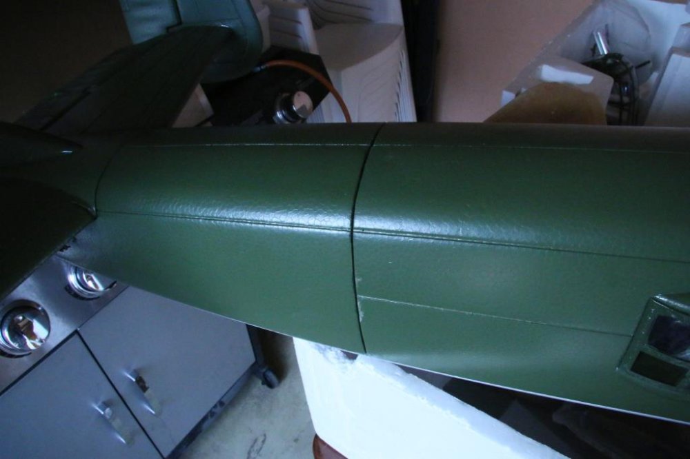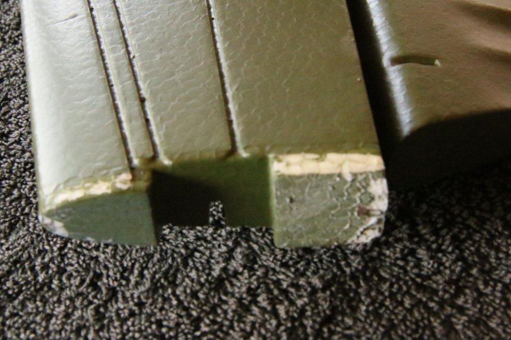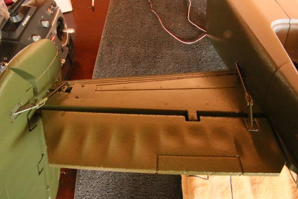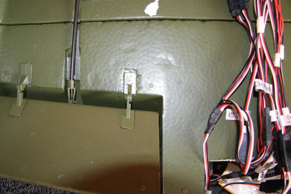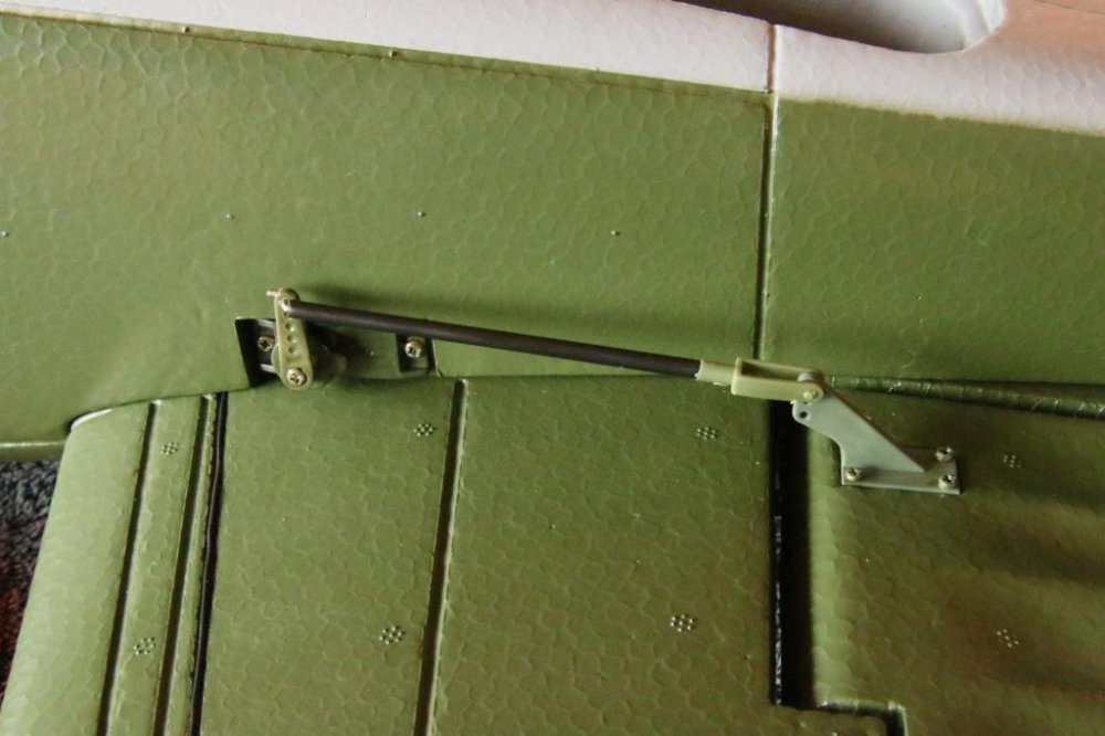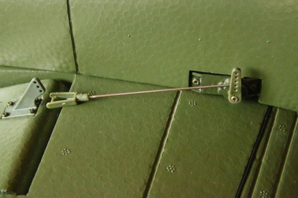 Das nächste Problem was sich auftat, waren die beiden Landeklappen. Man konnte machen was man wollte aber sie fuhren nicht in Neutralstellung. Bei genauerem hinsehen stellte ich festdass das Spaltmaß der Flaps nicht in Ordnung war. Ich habe auf jeder Seite ein Gelenk entfernt und habe es dann um ca. 3mm nach unten versetzt. Neu verklebt mit olivgrüner Farbe nachgepinselt und schon konnten die Flaps in Neutralstellung gebracht werden. Die Anlenkstangen bekamen dann wieder ein Stück Antennenrohr und wurden sorgfältig eingestellt.