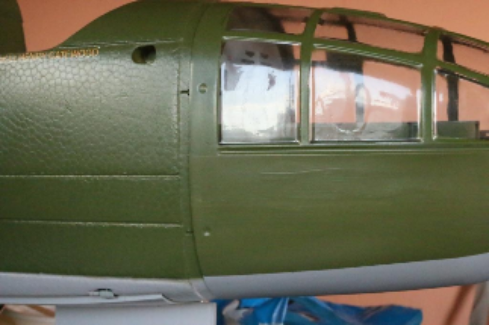 Das Fahrwerk arbeitet, zumindest beim Test ohne Probleme und fehlerfrei. Das einzigste Manko das Bugrad hatte einen Linksdrall, der aber über die richtige Gestängeeinstellung eingestellt werden konnte. So konnten auch hier jetzt die zu verklebenden Flächen geschliffen werden. Für die Tragfläche habe ich im Rumpf Markierungen gemacht, so konnte ich sehen wie weit ich den Kleber streichen musste. Um beimAaushärten des Epoxidklebers keinen steifen Arm zu bekommen wurde auch zu anderen Mitteln gegriffen die auch ihren Zweck erfüllen. Nach aussreichender Aushärtung des Klebers wurde im Anschluß daran das Unterteil mit dem Bombenschacht verklebt. Hierbei ist darauf zu achten, dass man Nase und Heck etwas zusammendrückt damit die Nähte schön aneinander liegen. Alles zusammen wurde dann in die Ecke zum trocknen gestellt.