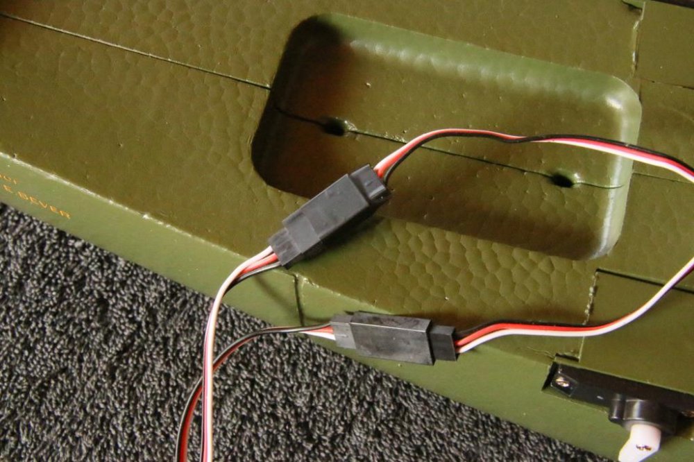 Die Flächen an denen die Seitenleitwerke befestigt (geklebt) werden, wurde die Farbe mittels Schleifpapier entfernt. Nachdem ich alles soweit vorbereitet hatte, wurden die beiden Seitenleitwerke mit dem mitgelieferten Kleber an die Fläche der Höhenruder geklebt, bzw. geschraubt. Bitte “vorher” die Gestänge der Seitenleitwerke einhängen. Den Kleber erst gut trocknen lassen und dann erst die Schrauben eindrehen. Die Schrauben nur beidrehen und nicht bis zum Anschlag eindrehen, sonst stehen die Seitenleitwerke schief. Mit einem Winkel gemessen ergibt sich durch die nach oben schmaler zulaufenden Seitenleitwerke ein Spaltmaß von ca. 7mm. An dieser Stelle habe ich mich entschlossen auf den mitgelieferten Kleber möglichst zu verzichten, den die Klebkraft ist nicht sehr berauschend. Größere Flächen werde ich nur noch mit Epoxidharz (30min) kleben. Für den weiteren Zusammenbau wurden die Servokabel mit den Y-Kabel verbunden und mit Isolierband gesichert.