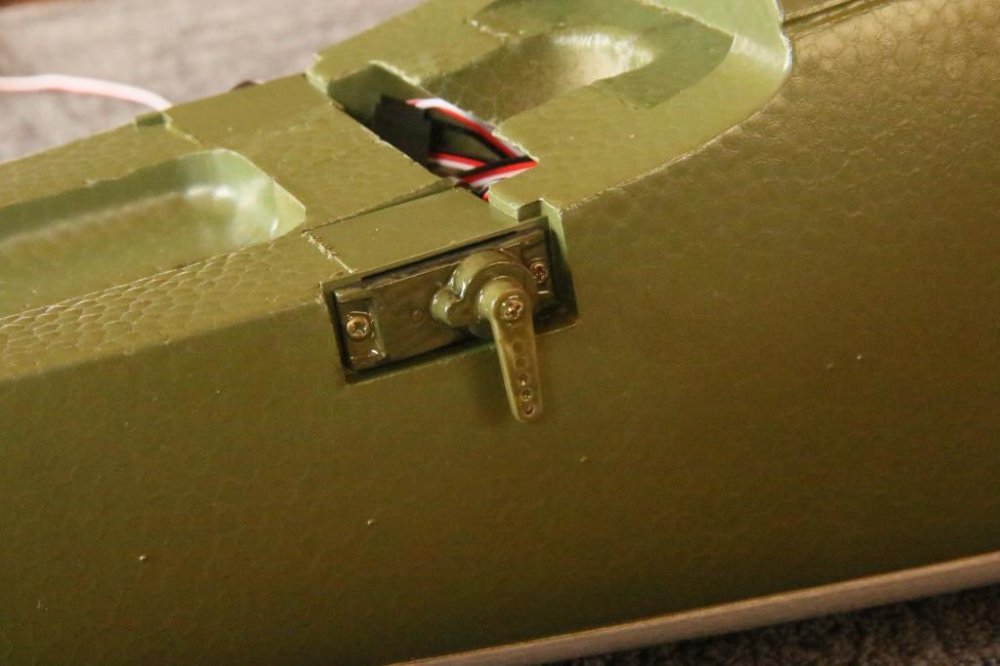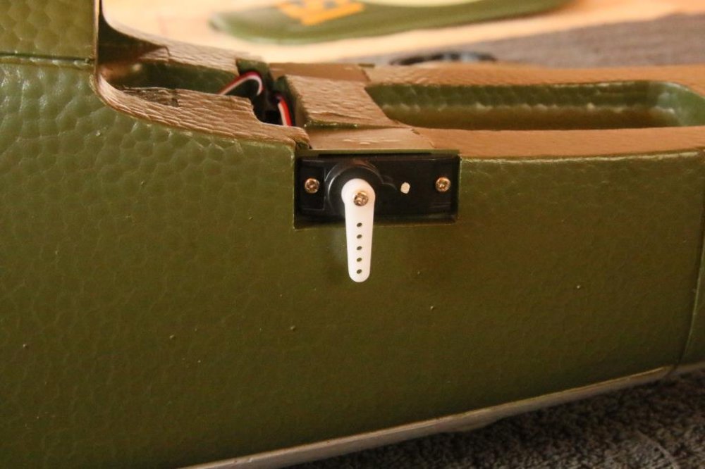 Zunächst wurden die Servos und die Servohörner gestrichen. Die passende Farbe habe ich bei Revell gefunden (Aqua Colour 36361 Olivgrün, Seidenmatt). Zusätzlich wurden auch alle Schraubenköpfe der Ruderbefestigungen gestrichen.