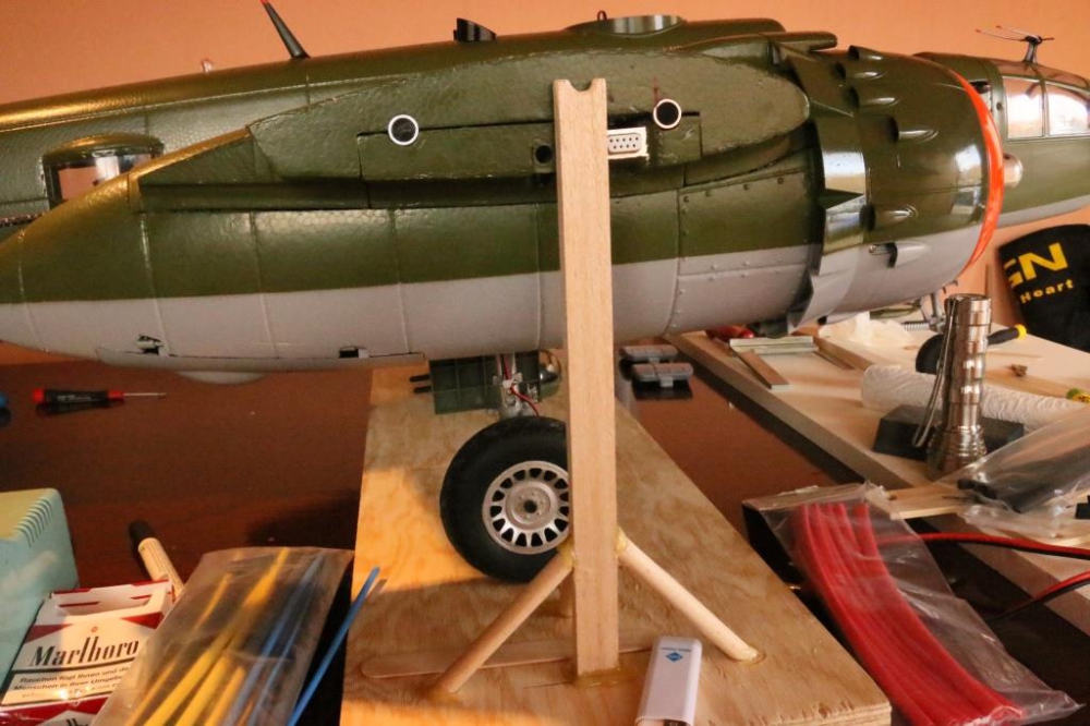 Ich habe mir eine Vorrichtung gebaut um den Schwerpunkt einzustellen und es sollt jetzt ertmalig das Fahrwerk in Fluglage eingezogen werden. Und das war der Knackpunkt. Ein Rad wurde nicht sauber eingezogen. Nun ja mein Akku war auch nicht mehr ganz frisch und so habe ich über Nacht alles  geladen und bin heute Morgen (Muttertag!) frisch ans Werk und war guter Dinge das alles funktioniert. Schließlich ist das Fahrwerk schon mehrmals ein und ausgefahren, allerdings auf dem Kopf liegenend.