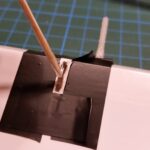 Nun werden die Horizontalstabilisatoren (oder Winglets) an die Flächenenden des Höhenleitwerks geklebt. Allerdings habe ich keinen Sekundenkleber benutzt, sondern 30 min. Epoxidkleber. Um den Stabilisator zu fixieren wurde dünne Pappe dazwischen geklemmt. Das Servo für das Höhenleitwerk wird verbaut. Für die Anlenkung gilt die gleiche Vorgehensweise wie bei den Querrudern und Klappen.