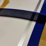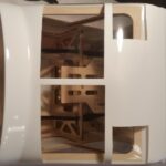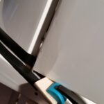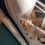 Als erstes wird Windschutzscheibe ungeschnitten auf den Rumpf gesetzt und auf die Lage der Scheibe geachtet. Es war ausreichend Überstand vorhanden und so erfolgte der erste Schnitt oberhalb am Dach. Gerade so viel, dass noch genug überstand, um im Finish noch etwas abschneiden zu können. Die nächsten Schnitte erfolgte an den Seiten und am Rumpf vorne, aber immer nur so viel, dass noch eine gewisse Sicherheit vorhanden ist. Dann wurde die Scheibe wieder aufgesetzt und die Passgenauigkeit geprüft. Dabei sind mir die unlackierten Holme aufgefallen. Das wurde entsprechend geändert indem ich die Holme mit weißer Farbe gestrichen habe. Für die Montage der Windschutzscheibe entschied ich mich nicht für Klebstoff, sondern für die geschraubte Variante. Als Schrauben wurden selbstschneidende Inbusschrauben 2,5×8 mm in Schwarz benutzt. Die grob geschnittene Scheibe wird passend auf den Rumpf gesetzt und mit Klebeband fixiert. Anschließend werden die Löcher für die Schrauben markiert und mit einem 1,5 mm gebohrt. Danach werden die Kanten der Scheibe nochmals geschnitten, so dass von dem Bohrloch noch ca. 3 mm Material stehen blieb. Die Scheibe wurde nicht montiert, sondern zur Seite gelegt um zunächst erst die noch folgenden Arbeitsschritte zu tätigen. So hat man mehr Platz um im Innerraum noch Arbeiten zu verrichten.