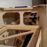 Bevor der bewegliche Teil des Höhenleitwerkes montiert wird, ist die Folie auf die kleinen Holzplättchen zu bügeln. Diese sind dafür da um die große Öffnungen am Heck zu schließen. Damit die Abdeckungen beim Kleben nicht in den Rumpf fallen habe ich vor kleine Balsastreifen als auf Auflage in die Öffnungen eingeklebt.