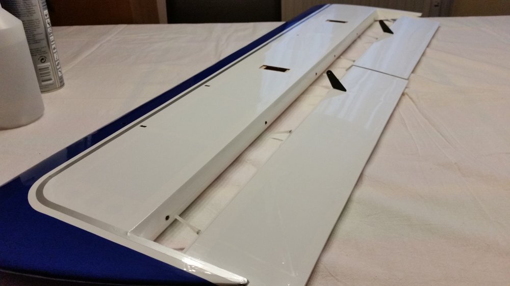 2. Montage der Flächen Die Ruderhörner sind an der Klebestelle anzuschleifen. Ich habe sie schwarz lackiert, das hebt das Ganze etwas ab, ist aber kein muss. Die zu verklebenden Enden müssen angeschliffen werden. Vor dem Verkleben ist die Passgenauigkeit zu überprüfen. Die Klebestellen werden mit Isolierband abgeklebt. Die Ruderhörner werden mit 30 min. Epoxidkleber verklebt. Auf korrekten Sitz achten. Überschüssiger Kleber wird mit Isopropanol abgerieben. Während der Trocknungsphase habe ich die Tragflächen nachgebügelt, denn beim genaueren Hinsehen habe ich festgestellt das doch einige Blasen und Falten in der Folie waren.