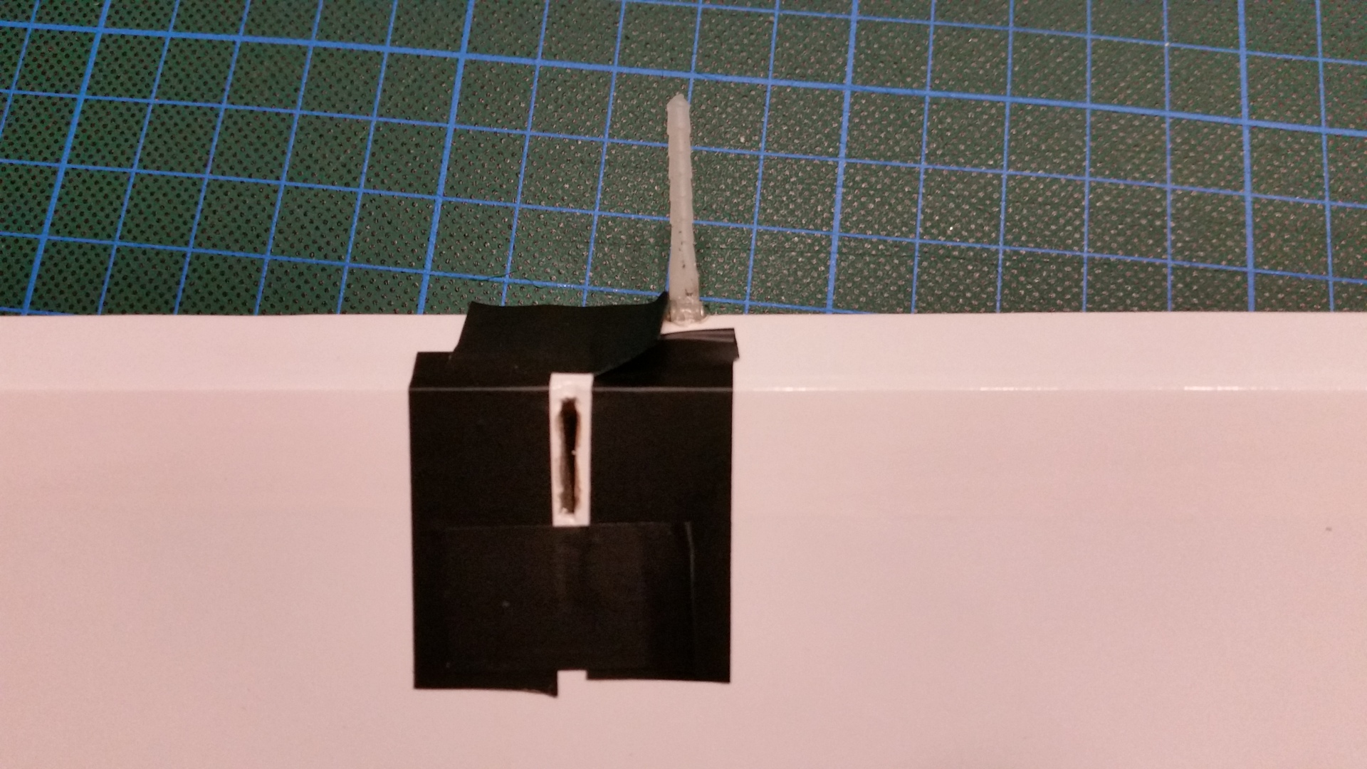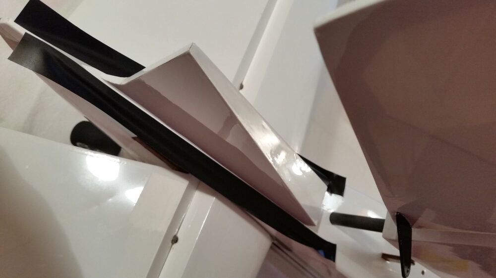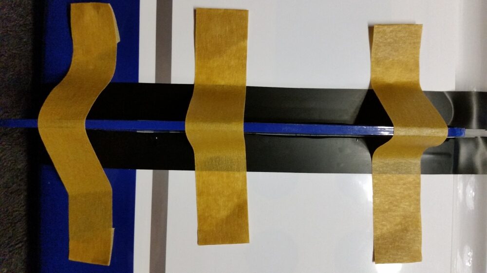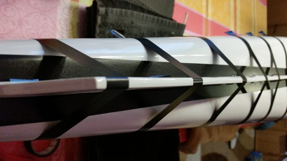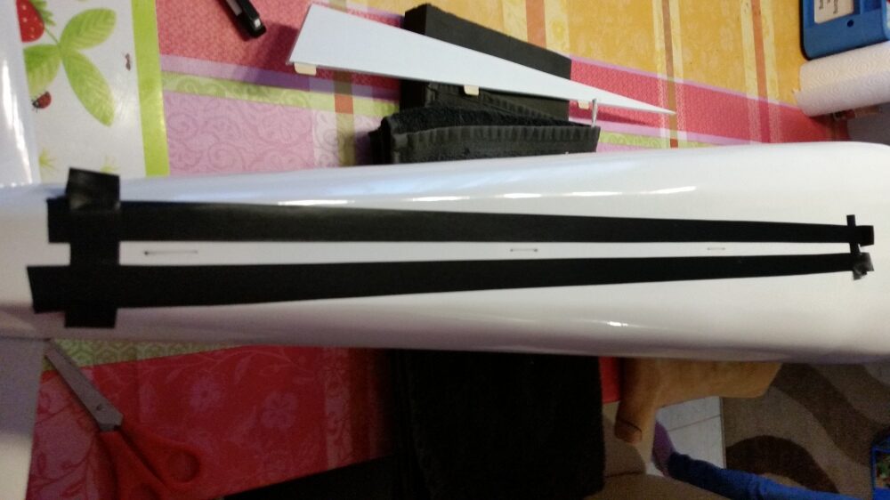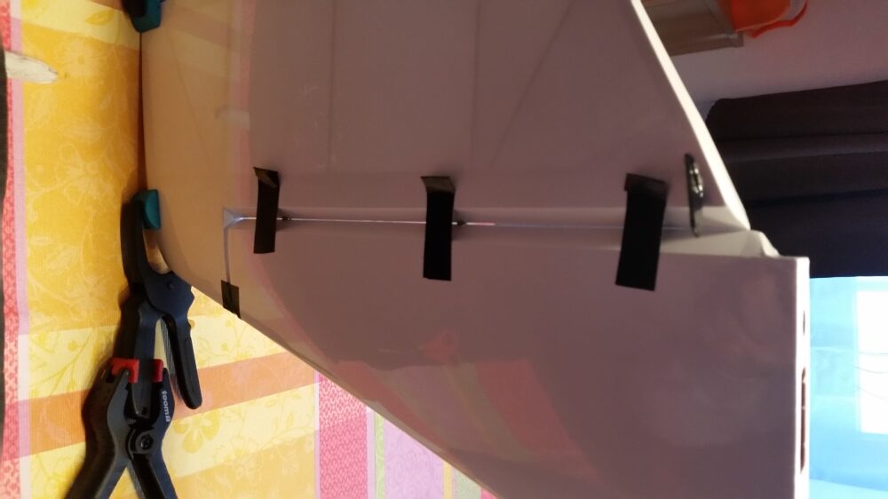 Die Montage des unteren Kiels ist Problemlos. Die Teile auf Passgenauigkeit prüfen, die Klebestellen links und rechts vom Kiel abkleben und den Kiel mit 30 min. Epoxid festkleben. Den Kiel auf den rechten Winkel zum Rumpf prüfen und mit Klebeband fixieren.