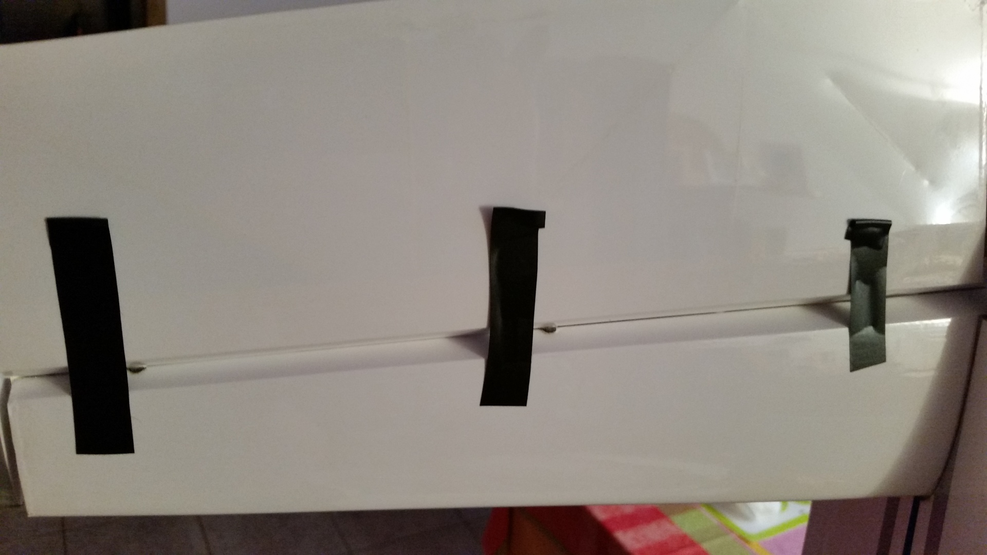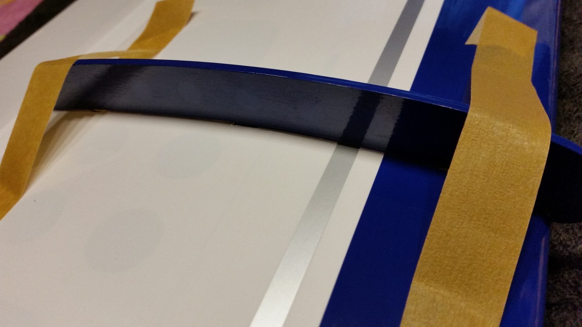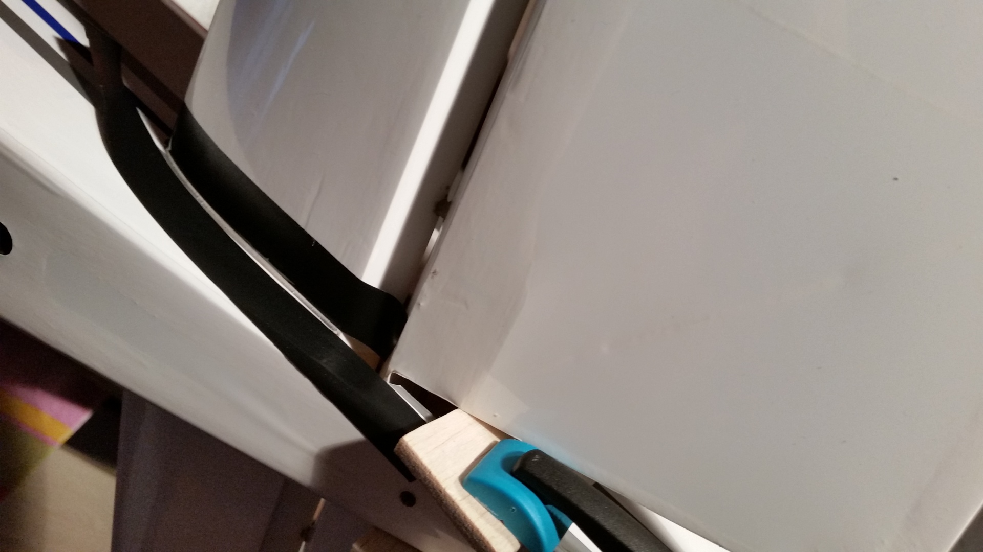 Die Montage des unteren Kiels ist Problemlos. Die Teile auf Passgenauigkeit prüfen, die Klebestellen links und rechts vom Kiel abkleben und den Kiel mit 30 min. Epoxid festkleben. Den Kiel auf den rechten Winkel zum Rumpf prüfen und mit Klebeband fixieren.