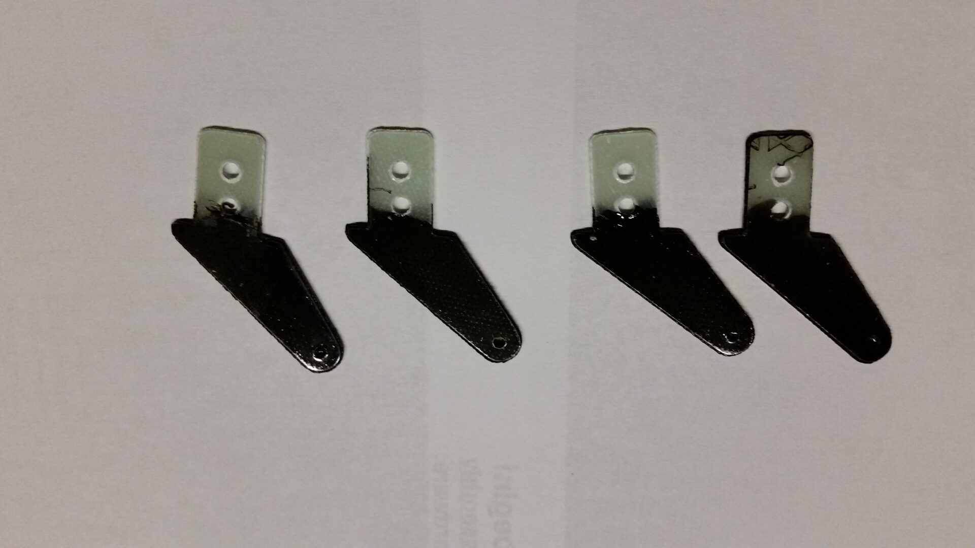 Nun werden die Horizontalstabilisatoren (oder Winglets) an die Flächenenden des Höhenleitwerks geklebt. Allerdings habe ich keinen Sekundenkleber benutzt, sondern 30 min. Epoxidkleber. Um den Stabilisator zu fixieren wurde dünne Pappe dazwischen geklemmt. Das Servo für das Höhenleitwerk wird verbaut. Für die Anlenkung gilt die gleiche Vorgehensweise wie bei den Querrudern und Klappen.