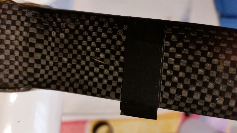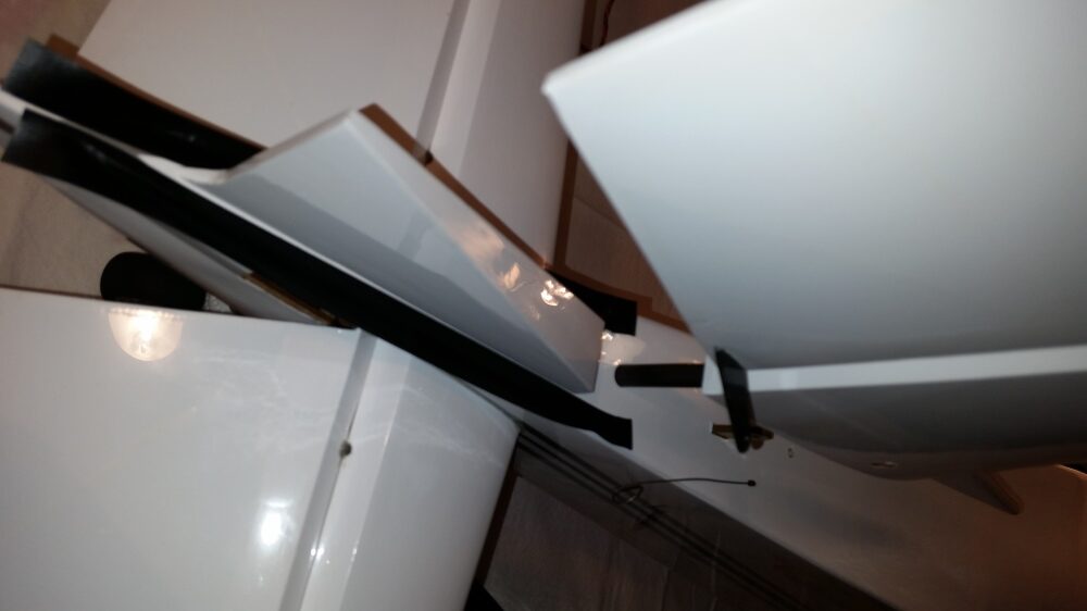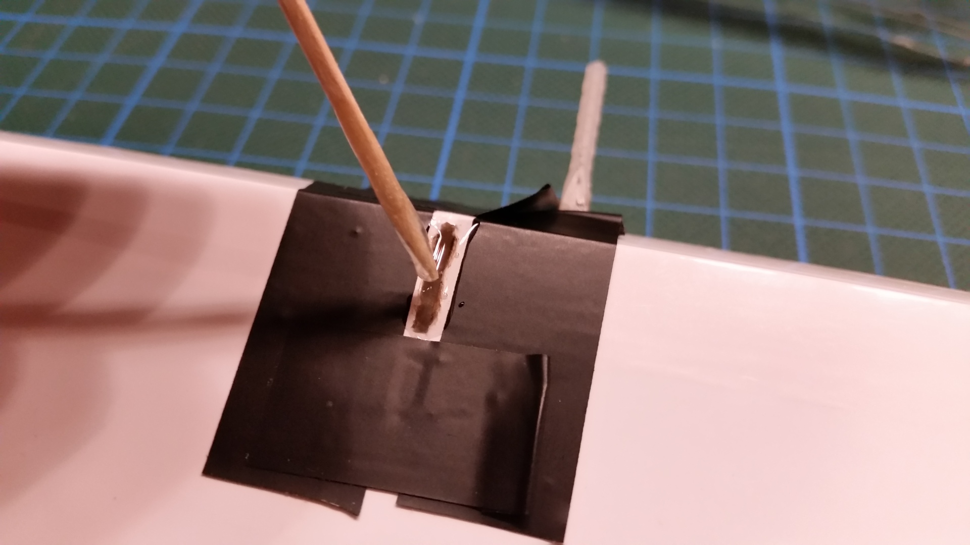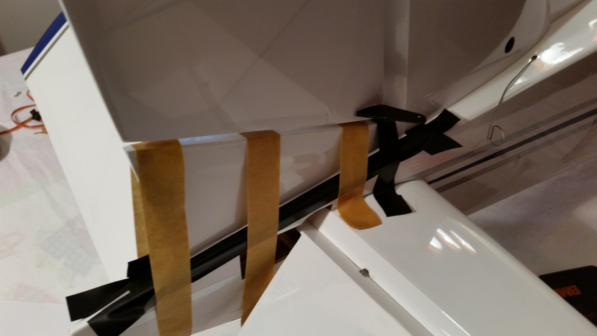 2. Montage der Flächen Die Ruderhörner sind an der Klebestelle anzuschleifen. Ich habe sie schwarz lackiert, das hebt das Ganze etwas ab, ist aber kein muss. Die zu verklebenden Enden müssen angeschliffen werden. Vor dem Verkleben ist die Passgenauigkeit zu überprüfen. Die Klebestellen werden mit Isolierband abgeklebt. Die Ruderhörner werden mit 30 min. Epoxidkleber verklebt. Auf korrekten Sitz achten. Überschüssiger Kleber wird mit Isopropanol abgerieben. Während der Trocknungsphase habe ich die Tragflächen nachgebügelt, denn beim genaueren Hinsehen habe ich festgestellt das doch einige Blasen und Falten in der Folie waren.