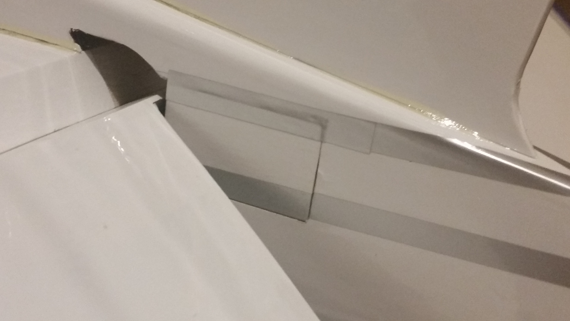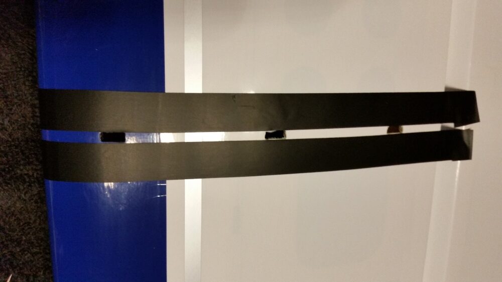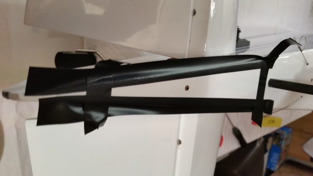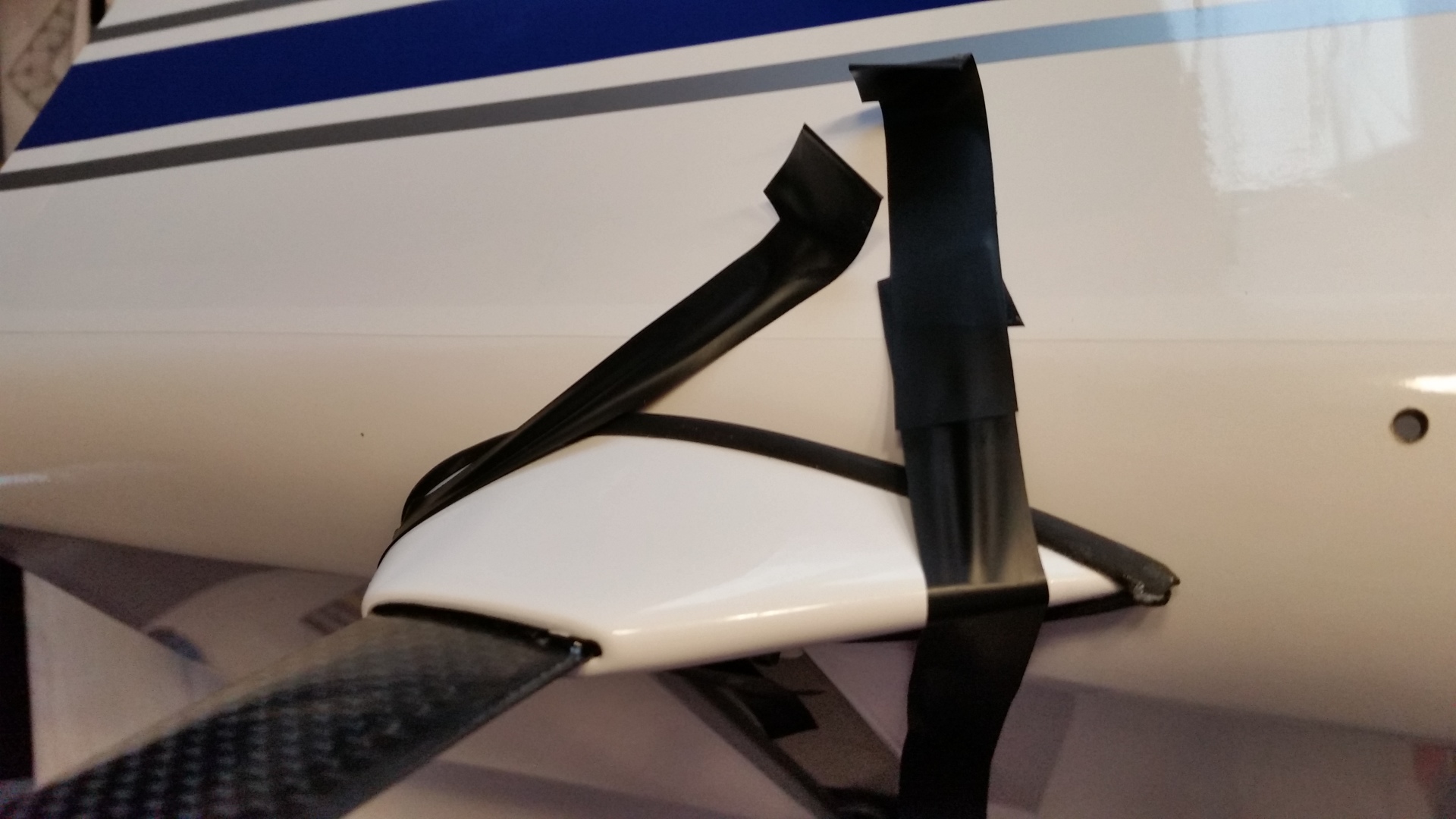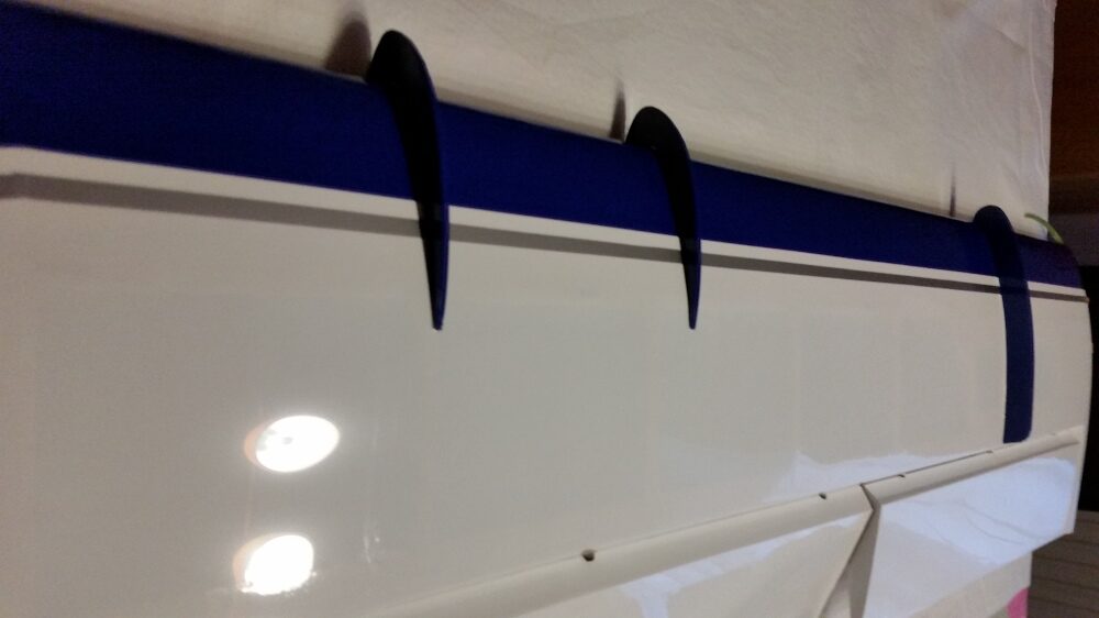 was aber im Deutschen Wortlaut eigentlich ein Grenzschichtzaun ist. Der wiederum ist ein aerodynamisches Hilfsmittel um das Strömungsverhalten an den Flugzeugtragflächen zu verbessern. Der Grenzschichtzaun bei der Bushmaster 84“ verhindert somit die Querströmung in der Grenzschicht und damit ein Abfließen der Strömung zur Tragflächenspitze. Damit soll der Strömungsabriss an der Tragfläche verhindert werden und ein zu schnelles abkippen vermieden werden. Die Wing Fences zur Anprobe auf die Flächen stecken und auf die Passgenauigkeit überprüfen. Es musste nichts nachgearbeitet werden. Die Folie war bereits ausgeschnitten. Rechts und links der Wing Fences mit Klebeband abkleben, die Flächen dazwischen mit 30 min. Epoxid bestreichen und die Wing Fences aufstecken, ausrichten und mit Klebeband fixieren.