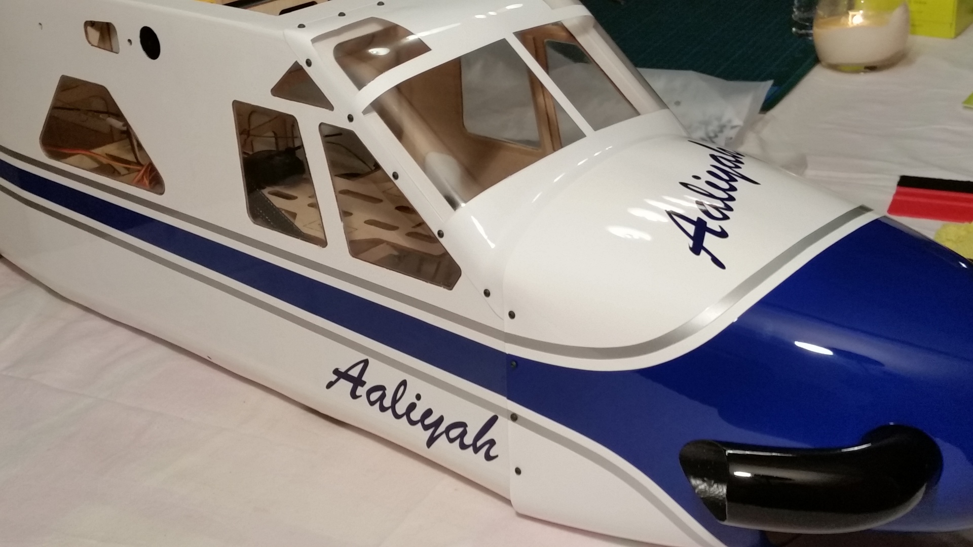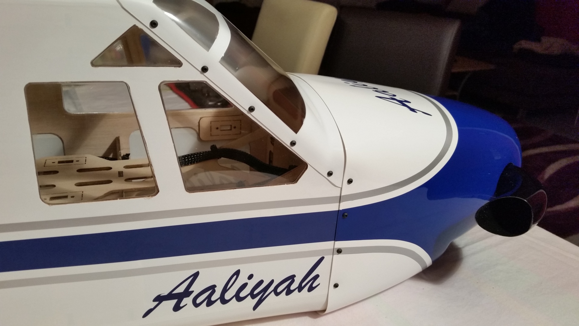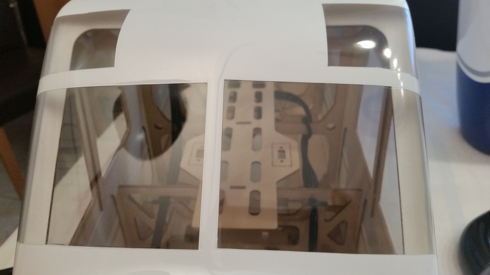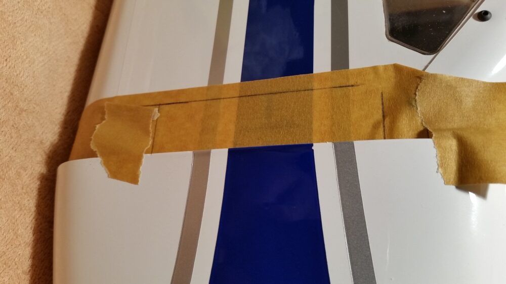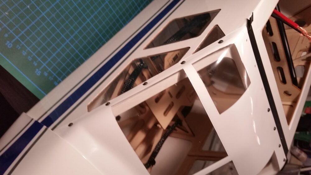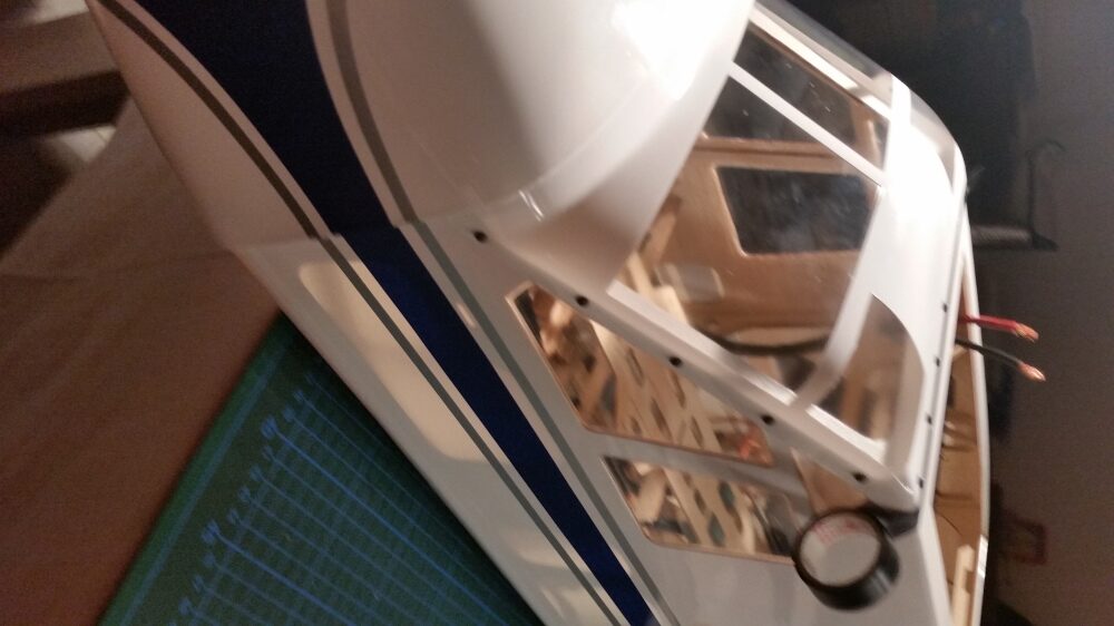 Als erstes wird Windschutzscheibe ungeschnitten auf den Rumpf gesetzt und auf die Lage der Scheibe geachtet. Es war ausreichend Überstand vorhanden und so erfolgte der erste Schnitt oberhalb am Dach. Gerade so viel, dass noch genug überstand, um im Finish noch etwas abschneiden zu können. Die nächsten Schnitte erfolgte an den Seiten und am Rumpf vorne, aber immer nur so viel, dass noch eine gewisse Sicherheit vorhanden ist. Dann wurde die Scheibe wieder aufgesetzt und die Passgenauigkeit geprüft. Dabei sind mir die unlackierten Holme aufgefallen. Das wurde entsprechend geändert indem ich die Holme mit weißer Farbe gestrichen habe. Für die Montage der Windschutzscheibe entschied ich mich nicht für Klebstoff, sondern für die geschraubte Variante. Als Schrauben wurden selbstschneidende Inbusschrauben 2,5×8 mm in Schwarz benutzt. Die grob geschnittene Scheibe wird passend auf den Rumpf gesetzt und mit Klebeband fixiert. Anschließend werden die Löcher für die Schrauben markiert und mit einem 1,5 mm gebohrt. Danach werden die Kanten der Scheibe nochmals geschnitten, so dass von dem Bohrloch noch ca. 3 mm Material stehen blieb. Die Scheibe wurde nicht montiert, sondern zur Seite gelegt um zunächst erst die noch folgenden Arbeitsschritte zu tätigen. So hat man mehr Platz um im Innerraum noch Arbeiten zu verrichten.