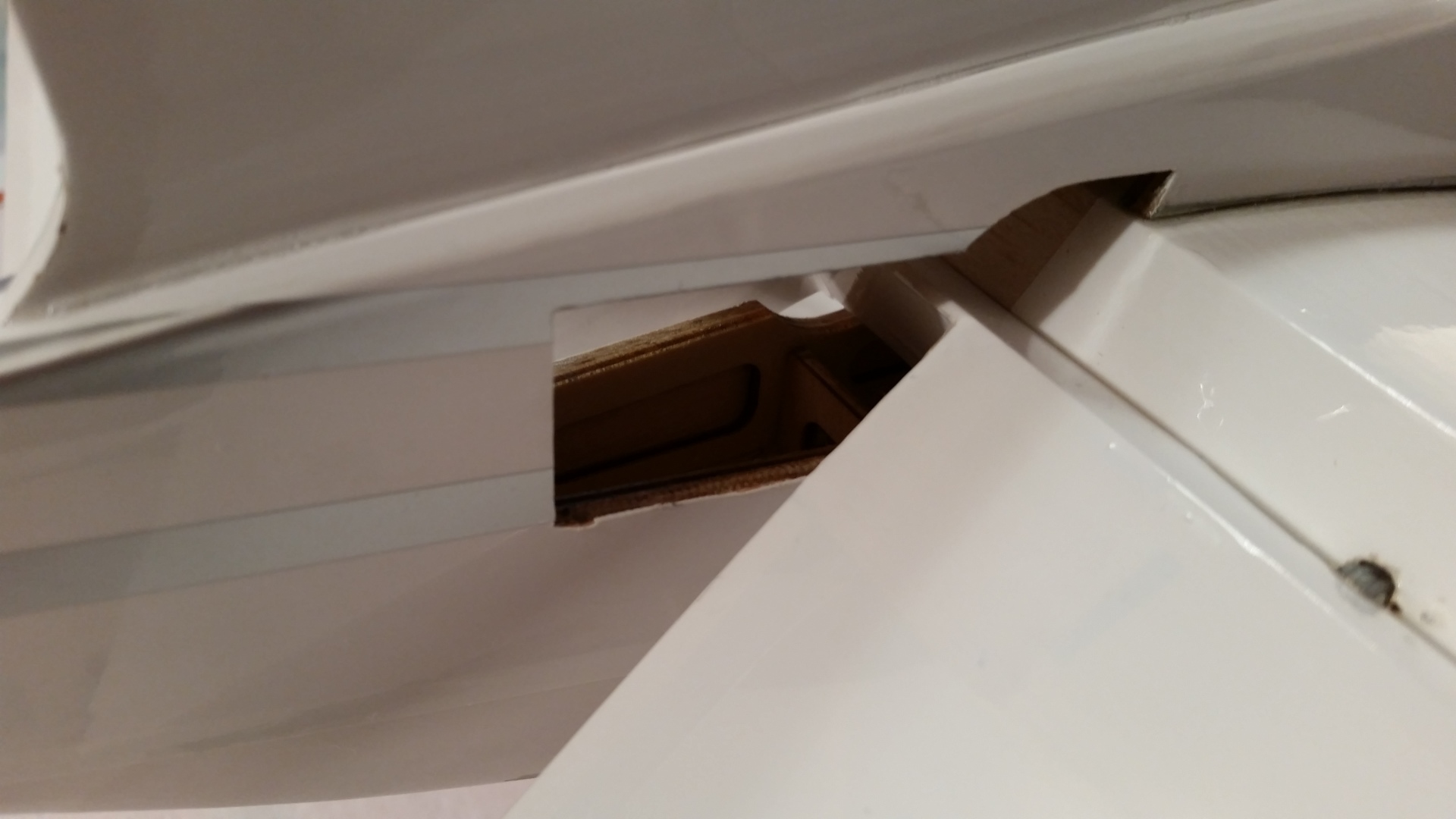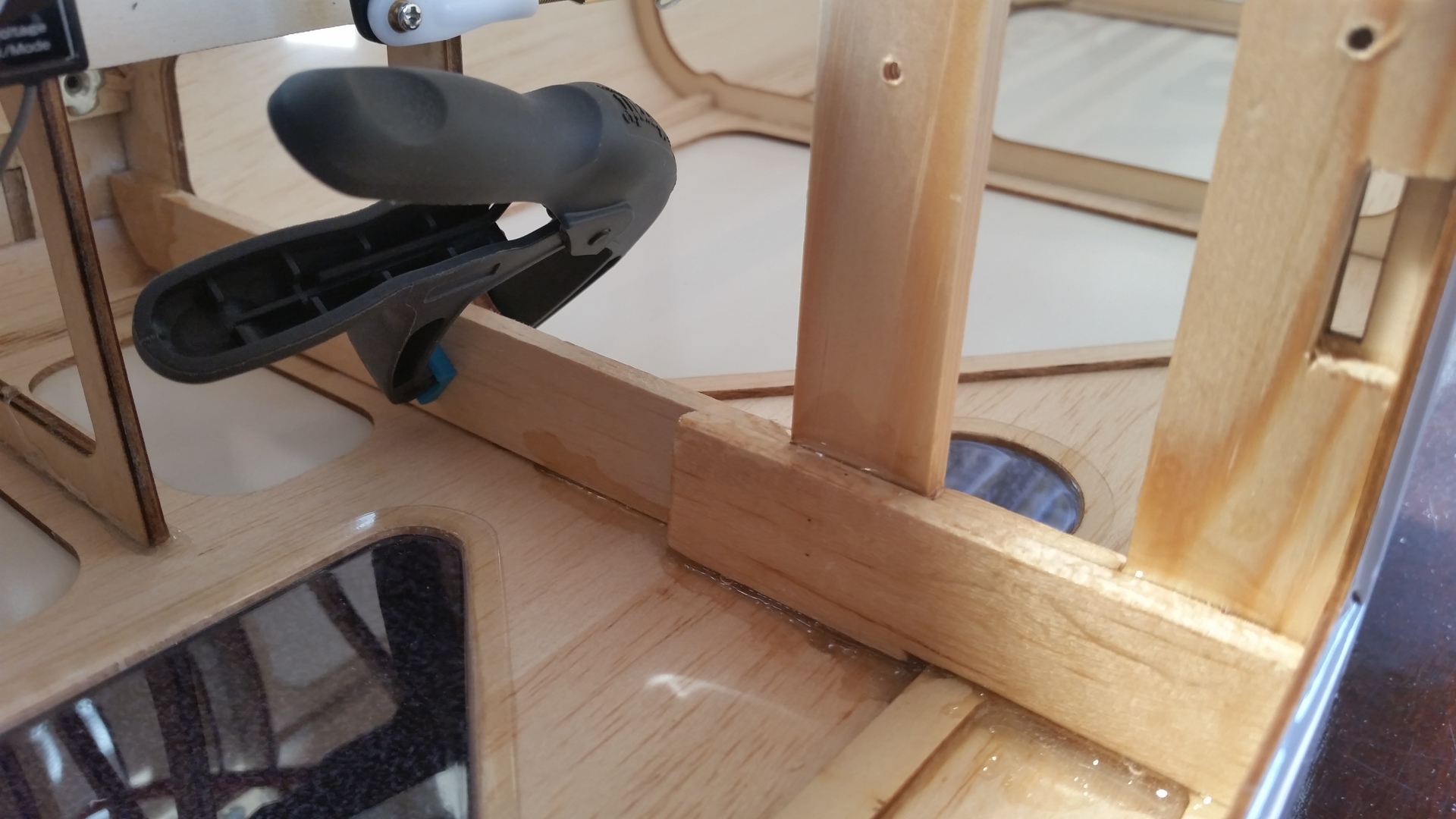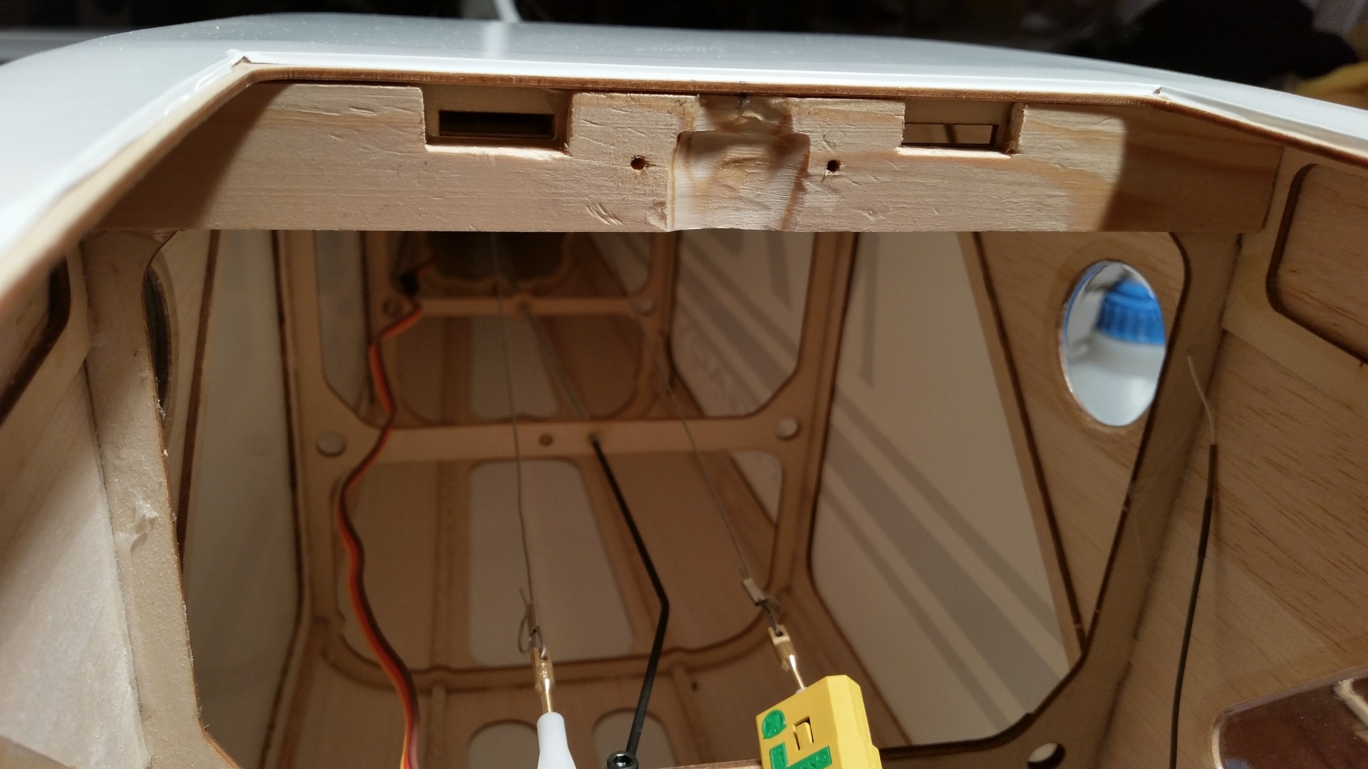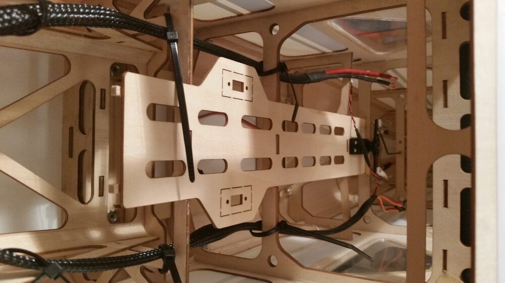 Der Plan war die Bushmaster als Schleppmodell für Segler zu benutzen und so war es an der Zeit die Schleppkupplung an einer geeigneten Stelle zu verbauen. Die Schleppkupplung ist nicht Bestandteil des Baukastens! Ich entschloss mich für die Schleppkupplung von „E-R Modellbau – Schleppkupplung Profi 2“. Um der Schleppkupplung einen stabilen Halt zu geben, wurde der Mittelholm verstärkt, was in den Bildern sehr gut zu erkennen ist. Nach dem Trocknen des Klebers wurde die Grundplatte mit Schleppkupplung und Servo auf die Verstärkung geschraubt. Zum Schluß wurde die Kabinenabdeckung ausgefräst und wieder mit Balsaleisten verstärkt.