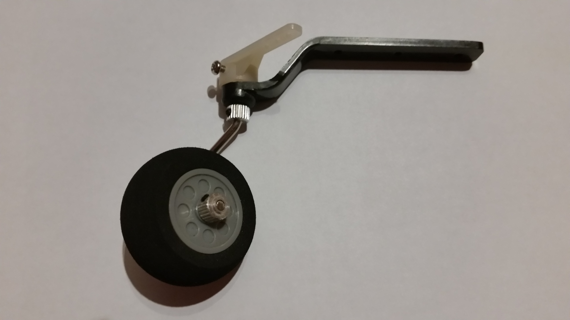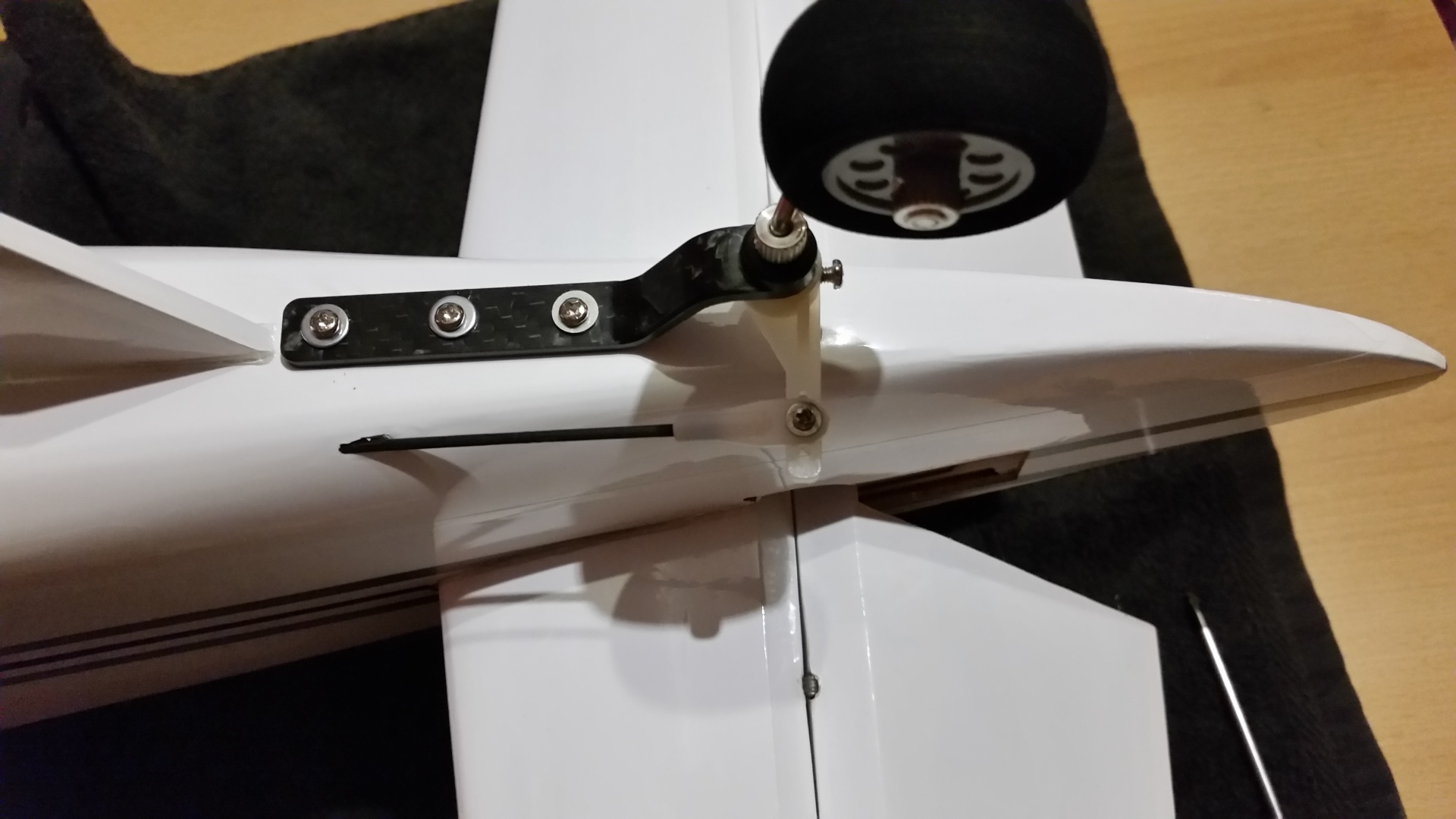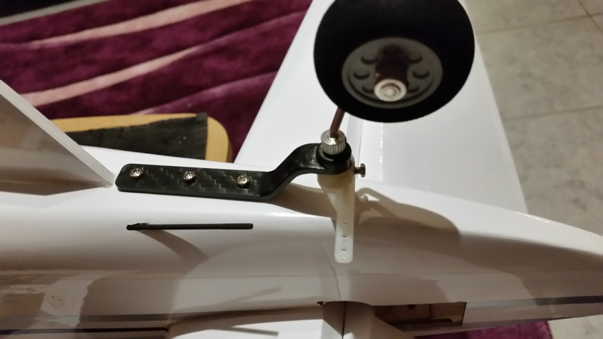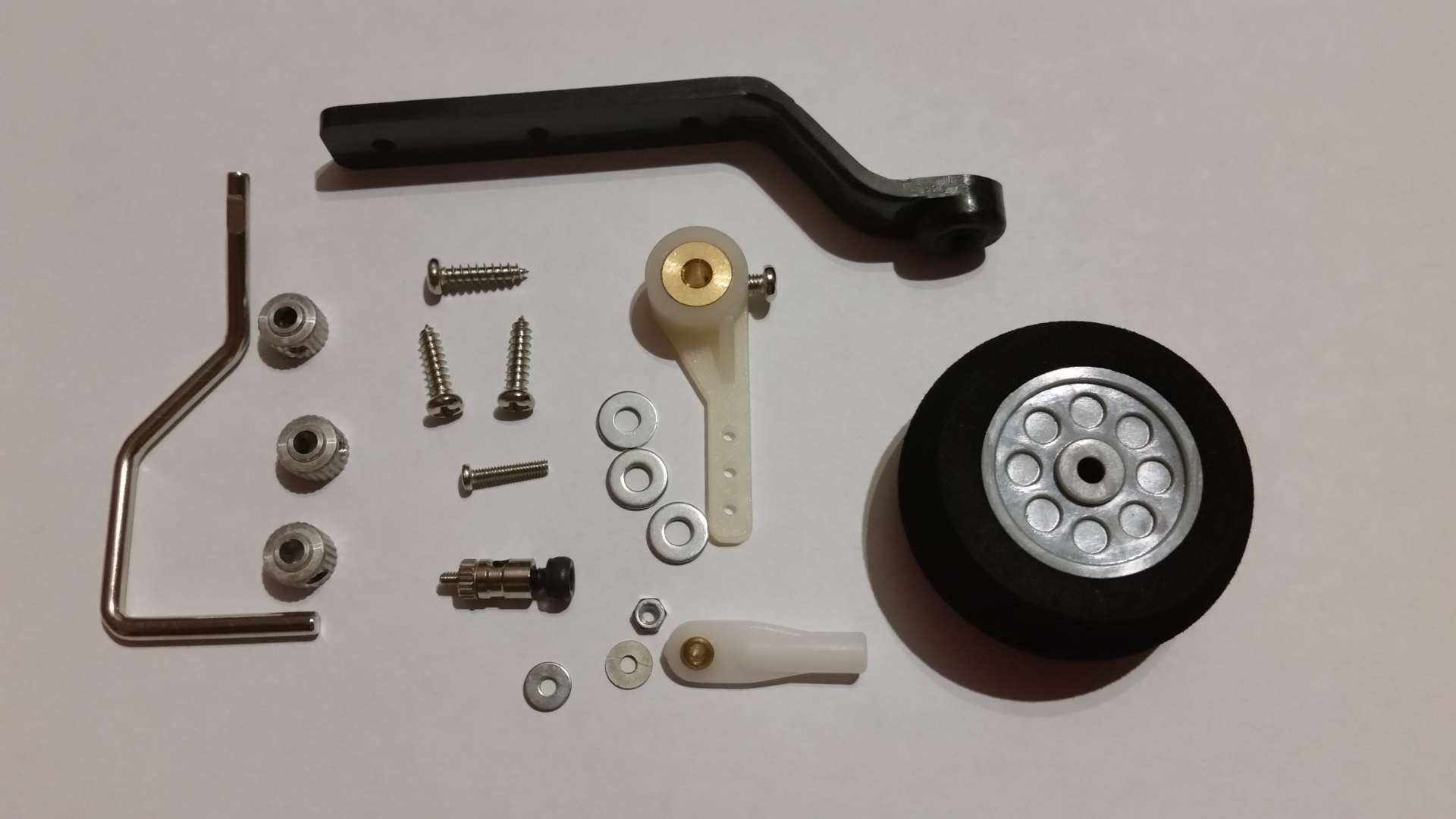 Das Rad auf die Radachse stecken und mit dem Ring sichern. Die Madenschraube wird mit Loctite gesichert. Das vorgefertigte Rad wird nun mit der Stange in die Aufnahme gesteckt. Für den Ruderhebel muss an der Stange nicht gefeilt werden. Eine entsprechende Nut ist vorhanden. Die Schraube vom Ruderhebel und die Madenschraube des Sicherungsrings werden auch wieder mit Loctite gesichert. Das Spornrad mit der Befestigungsschien auf den Rumpf auflegen und ausrichten und die Befestigunslöcher auf den Rumpf übertragen. Ich habe festgestellt, dass das Rad nicht im rechten Winkel zu Rumpf steht und hebe dementsprechend die Achse etwas nachgebogen. Die Löcher mit 1,5 mm Bohrer vorbohren. In die Bohrlöcher Sekundenkleber einträufeln und das Spornrad mit dem Rumpf verschrauben. Zuletzt wird die Anlenkstange mit dem Gewinde zuerst vom Rumpf kommend in das Plastikrohr geschoben und am Ausgang vorsichtig (vorher etwas aufschneiden) durchgestoßen. Den Kugelkopf mit 2 mm Bohrer aufbohren und auf das Gewinde aufschrauben und anschließend am Ruderhebel befestigen.