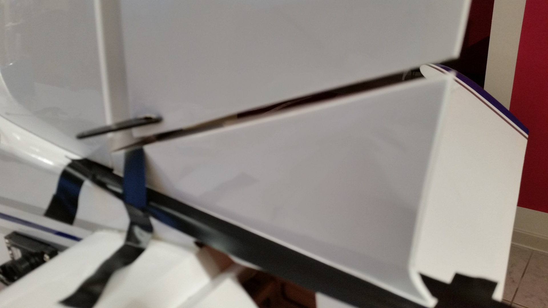 Die Montage des Höhenleitwerkes ist aufwendiger und es muss an dieser Stelle sehr genau gearbeitet werden um im Anschluss ein gutes Flugverhalten zu bekommen. Als erstes wird der bewegliche Teil des Höhenleitwerks ins Heck verfrachtet, anschließend der feststehende Teile. Da sich der feststehende Teil im Hohlraum des Hecks befindet und keine vollflächige Auflage im Rumpf vorhanden ist, ist es nicht unbedingt nötig die Folie an dieser Stelle zu entfernen. Geklebt wird an der Verbindung zum Rumpf mit 30 min. Epoxid. Vor dem Verkleben ist auf eine exakte Ausrichtung zu achten. Mittiger Abstand, sowie der Abstand zu den Flügelspitzen sollte gleich sein. An der Naht mit Klebeband sichern und das Heckteil mit dem Rumpf verkleben. Überschüssiger Kleber rechtzeitig abwischen.