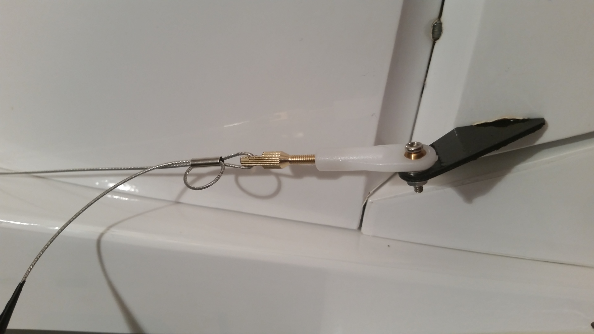 Hierzu werden als erstes die Gelenke, wie bereits schon beschrieben, mit 30 min. in das Epoxid in das Leitwerk geklebt. Nach Trocknung wird das Leitwerk mit dem feststehenden Teil verklebt. Jetzt werden die beigelegten Ruderhörner mit dem Seitenleitwerk verklebt. Vorher prüfen ob die Ruderhörner nicht zu lang sind, sonst stehen sie am Ende zu weit aus dem Leitwerk raus. Den oberen Kiel auf den Rumpf stecken. Das Kohlefaserrohr in das Seitenleitwerk stecken und anschließend das komplette Seitenleitwerk auf den Rumpf stecken. Das Seitenleitwerk im rechten Winkel zum Rumpf ausrichten und mit der beigelegten Schraube gegen verschieben sichern. Jetzt wird der obere Kiel mit dem Rumpf verklebt. Auch hier wird vorher wieder die Klebestelle mit Isolierband abgeklebt. Den überschüssigen Klebstoff rechtzeitig entfernen. Auch das Isolierband nach Antrocknung des Klebers abziehen und nicht warten bis der Kleber durchgetrocknet ist. Nun erfolgt die Montage des Servos für die Anlenkung des Seitenleitwerkes. Auch hier wurden die Kugelköpfe mit einem 2 mm Bohrer aufgebohrt. Die Seilzüge werden entsprechend der Abbildung mit den Kugelköpfen verbunden. Die Anlenkung für das Spornrad wurde vor dem Servo leicht abgewinkelt. Jetzt werden die Seilzüge noch mit Kugelköpfen am Seitenleitwerk verbunden. Darauf achten, dass hier die Seilzüge schon gut gespannt sind. Das Servo ist vorher auf eine neutrale Position einzustellen.