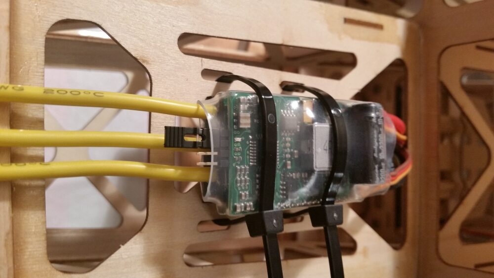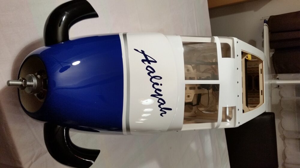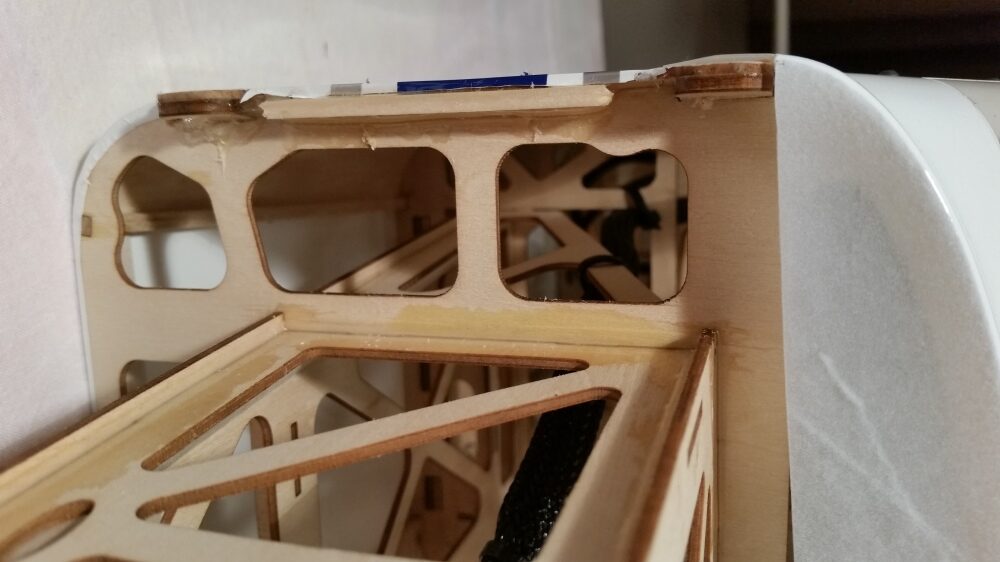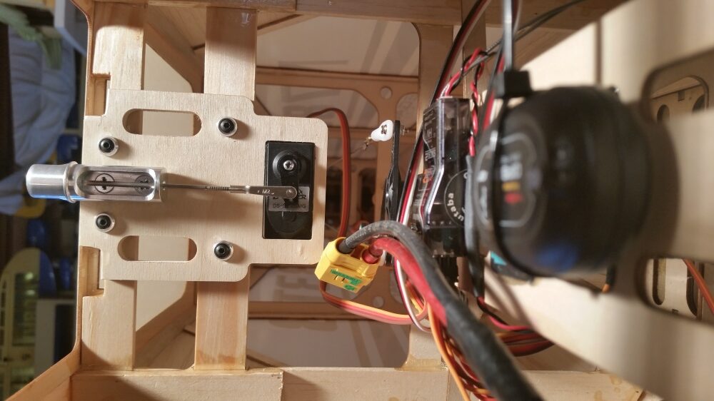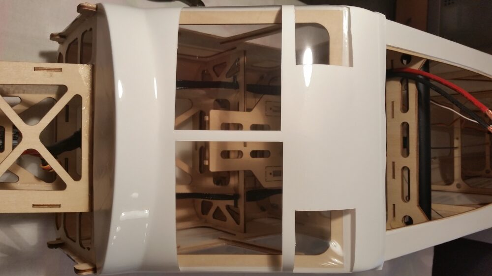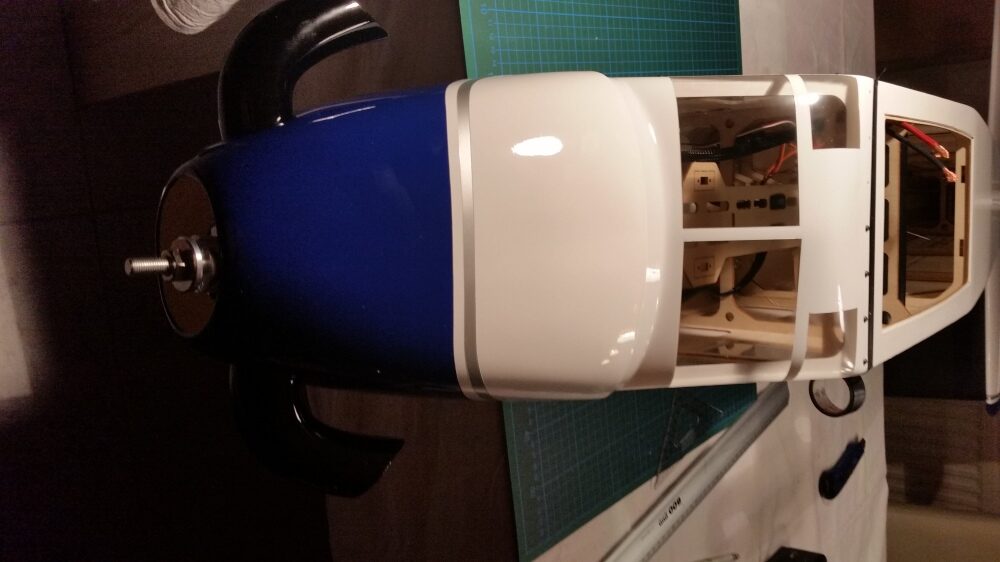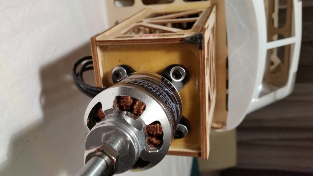 Den Motor gemäß der Herstellerangabe zusammenbauen. Alle Schrauben mit Sicherungslack versehen. Bevor die Montage des Motors am Spant erfolgt habe ich alle Nähte bis hin zur Batterieauflage mit Epoxidkleber verstärkt. Am Regler sind die Anschlusskabel und das Servokabel für die Motorsteuerung entsprechend zu verlängern. Danach wird der Regler unter dem Motorspant befestigt. Als Unterlage wurde eine Gummimischung verwendet um den Regler vor Erschütterungen zu schützen. Befestigt wird der Regler mit Kabelbindern. Nach Montage wurde die Motorabdeckung aufgesetzt und die Passgenauigkeit überprüft. Die Motorabdeckung hat soweit gepasst.