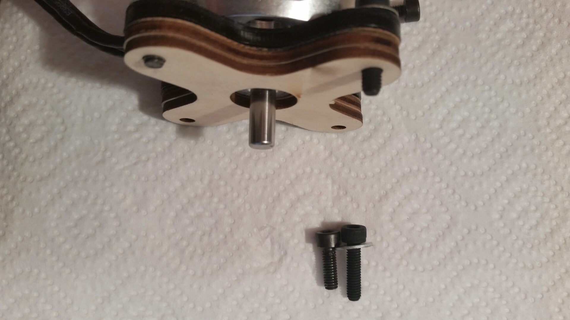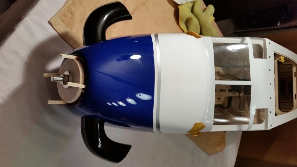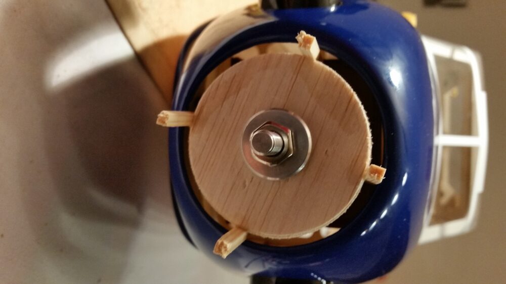 Nach der Montage Motor und Regler wurde der Zusammenbau der Motorabdeckung in Angriff genommen. Hierzu wurden zunächst die Klebeflächen an der Motorabdeckung und den Abgasrohren angeschliffen. Für die Verklebung wurde 5 min. Epoxid-Kleber verwendet. Die Bauteile wurden bis zur Trocknung mit Klebeband fixiert. Nachdem die Teile angetrocknet waren wurden wie in der original Bauanleitung, Klebestreifen an beiden Seiten angebracht und der Bereich in dem ich Bohren konnte nach außen übertragen. Anschließend wurde die Motorabdeckung aufgeschoben und mit einer selbstgebauten Zentralscheibe (ja ich weiß, aber sie hat ihren Zweck auch so erfüllt) fixiert. Danach wurden die Maße für die Bohrungen auf die Motorabdeckung übertragen und die Löcher für die Schrauben (selbstschneidende Inbusschrauben 2,5×8 mm) mit einem 1,5 mm gebohrt. Nachdem die Klebestreifen abgezogen wurden konnte die Motorabdeckung ausgerichtet und fest verschraubt werden.