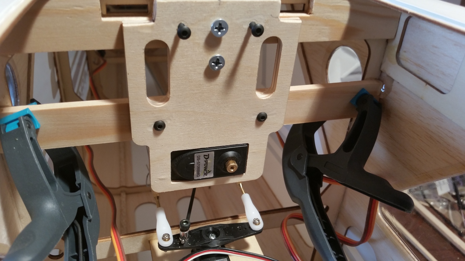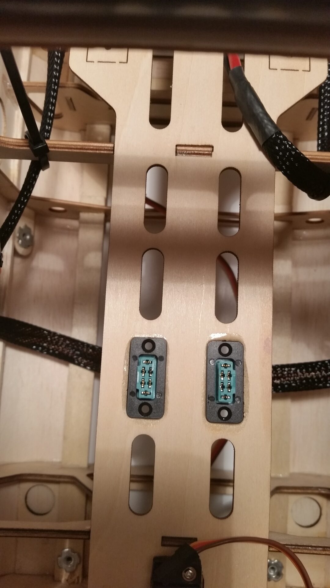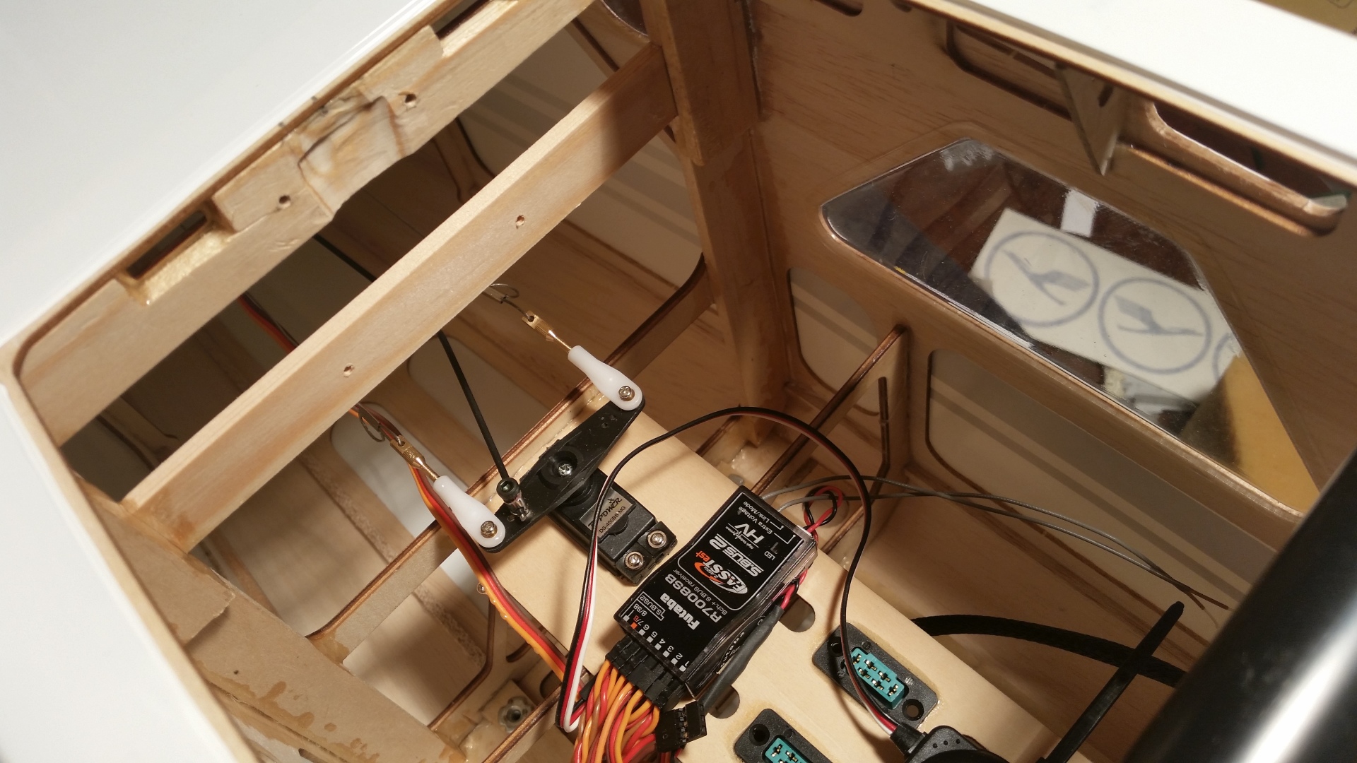 Nun wurde der Empfänger eingebaut und verkabelt. Für die Flächenservos wurden entsprechende Buchsen montiert, alles zusammengesteckt und ein erster Funktionstest durchgeführt.