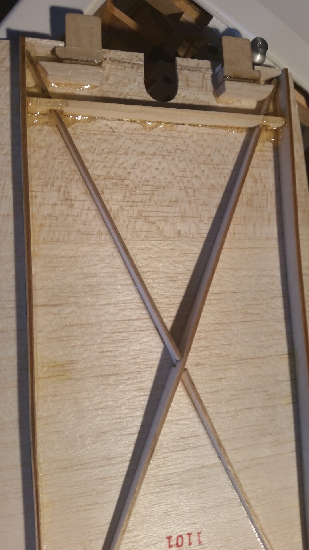Als nächstes werden die Scharniere mit dem Leitwerk verklebt. Gleiche Vorgehensweise wie bei den Tragflächen. Bilder hierzu gibt es ausführlich in der originalen Bauanleitung.